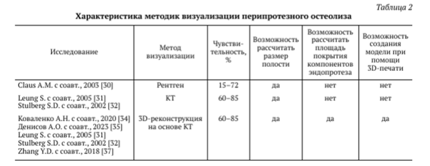 смотра объемного изображения [34]. Трехмерная реконструкция, при правильной сегментации и очистке изображения от имплантата, способна исчерпывающе показать выраженность изменений костной ткани вокруг компонентов эндопротеза. Также некоторые авторы описывают даже уменьшение интраоперационной кровопотери и сокращение времени операции при трехмерной визуализации на этапе планирования [36, 37]. Данные о характеристике методик визуализации перипро- тезного остеолиза представлены в таблице 2.