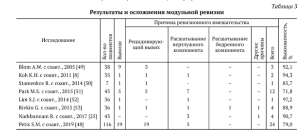 После модульной ревизии тазобедренного сустава вывихи эндопротеза могут встречаться с частотой от 2 до 48%, асептическое расшатывание вертлужного компонента развивается у 4-21% пациентов, а повторные ревизионные вмешательства выполняются в 3-20% случаев. При этом выживаемость эндопротезов после замены модульных компонентов, по данным национальных регистров, составляет от 73 до 97% на сроках от 2,8 до 10 лет (табл. 3).