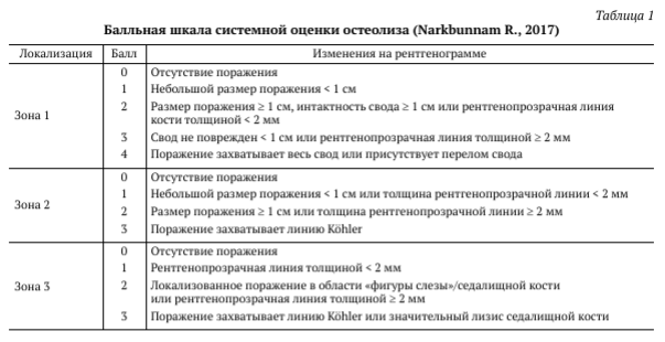 R. Narkbunnam с соавторами в своем исследовании предприняли попытку создать инструмент для количественной оценки остеолиза. На основании данных ретроспективной группы пациентов, прооперированных по поводу износа и остеолиза, была разработана балльная система оценки остеолиза (табл. 1). Предложенная система оценивает расположение и распространенность остеолиза в зонах по DeLee и Charnley, преобразуя данные в сумму баллов для дальнейшей интерпретации. Авторы отметили, что пороговым значением для асептического расшатывания вертлужного компонента является сумма баллов 5 и более, при этом чувствительность данного метода составляет 0,79, а специфичность — 0,87 [25].