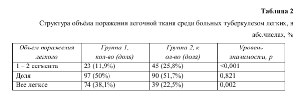 Анализ распространенности различных форм туберкулезного процесса выявил преобладание распространенных форм в группе курильщиков по сравнению с группой некурящих: 171 человек (88,1%) и 129 человек (74,1%) соответственно, p<0,001. Также были получены значимые различия в структуре объёма поражения, которые представлены в таблице 2.