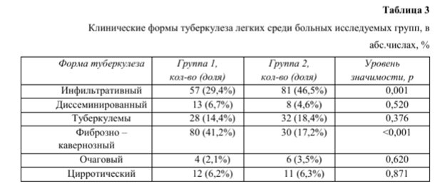 Структура клинических форм туберкулеза легких в группе курящих и некурящих пациентов представлена в таблице 3.