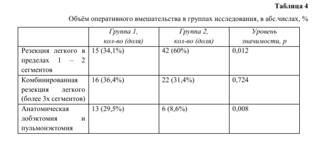 В структуре объёма оперативного вмешательства в группах исследования были получены значимые различия, которые представлены в таблице 4.