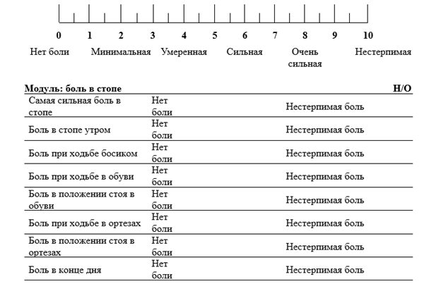 Вопросник состоит из 23 пунктов, сгруппированных в 3 модуля: боль (9 вопросов), нарушение функции (9 вопросов) и ограничение физической активности (5 вопросов). Каждый параметр оценивается по визуальной аналоговой шкале. Значение ответа определяется путем сравнения расположения отметки с шаблоном, разделенным на 10 одинаковых сегментов, и оценивается от 0 до 9 баллов. На некоторые вопросы пациент может не отвечать и отметить их в графе «нет ответа». Расчет результата в каждом модуле производится отдельно по отношению к вопросам, на которые пациент ответил, в виде значения в диапазоне от 0 до 100. Общий результат рассчитывается как арифметическое среднее между результатами, полученными в каждом модуле, и представлен так же в формате от 0 до 100, где 100 соответствует наихудшему состоянию стоп. Оцениваемый интервал - 1 неделя.