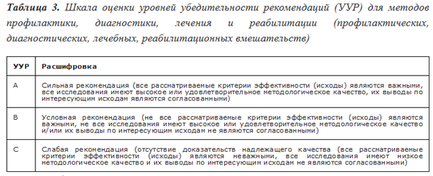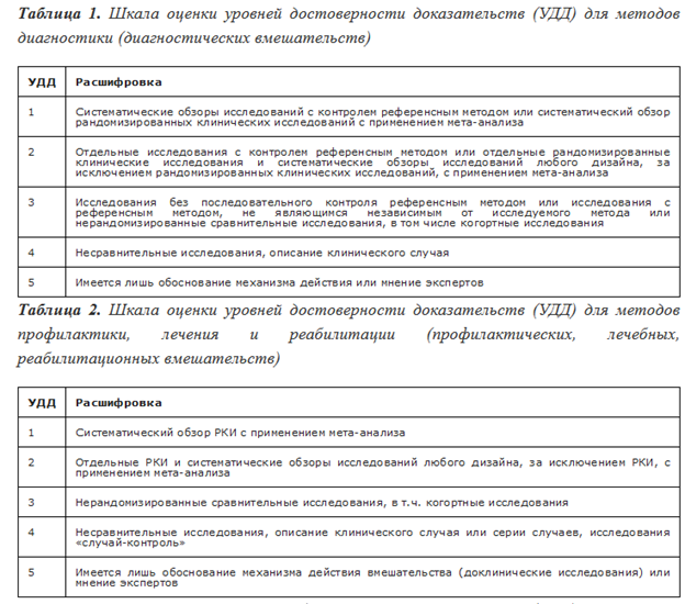 Уровень достоверности доказательств, содержащихся в публикациях, оценивали в соответствии с таблицами 1 и 2. Отбирали публикации с максимальным уровнем достоверности доказательств.