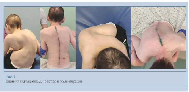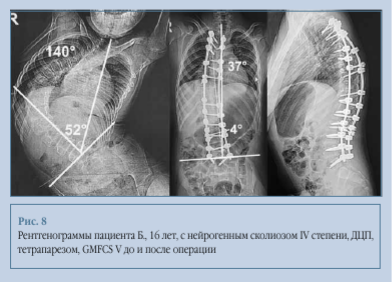 Клинический пример 2. Пациент Д., 15 лет, с нейрогенным сколиозом IV степени, ДЦП, тетрапарезом, GMFCS IV (рис. 8, 9). Исходный перекос таза - 52°, угол деформации по Cobb - 140°. Выполнили коррекцию на уровне Thj