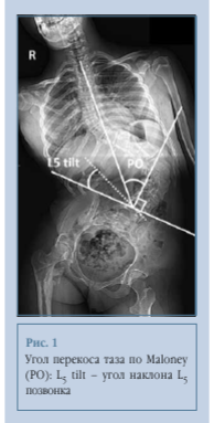 В исследование вошли 45 пациентов 10-17 лет, проходивших лечение в 2012-2024 гг. Всем пациентам выполнены постуральные рентгенограммы (в положении сидя). Величину деформации позвоночника оценивали по методике Cobb до и после операции. Также оценивали параметры сагиттального и фронтального баланса, в том числе во фронтальной плоскости - перекос таза по методике Maloney, наибольшая надежность данного метода показана Shrader et al. [16]. Изучили показатель наклона L5 позвонка, определяемого как угол между линиями, проведенными через верхние границы подвздошных гребней и по краю верхней замыкательной пластинки L5 позвонка (рис. 1).