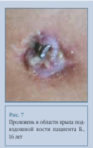 У пациента отмечался пролежень в месте нахождения винта в подвздошной кости через 12 мес. после операции из-за выраженного дефицита подкожно-жировой клетчатки, что потребовало пластики дефекта местными тканями (рис. 7). Через 25 мес. на контрольной рентгенограмме отмечен перелом стержня (рис. 5), выполнили ревизию и его замену.