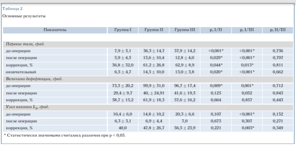 Полученные данные свидетельствуют об отсутствии достоверных различий в степени коррекции фронтального тазового наклона в группах II и III, то есть вне зависимости от включения/невключения таза в зону спондилодеза у пациентов с перекосом таза более 15° (р > 0,01).
