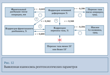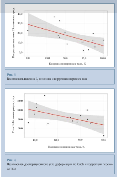 Данная зависимость усиливается до r = -0,662 (p < 0,05), если исключить пациентов с низкой коррекцией основной дуги (менее 50 %). Это свидетельствует о том, что чем выше наклон L5, тем меньше ожидаемая коррекция перекоса таза даже при хорошей коррекции основной дуги деформации.
