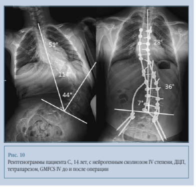 Клинический пример 3. Пациент С., 14 лет, с нейрогенным сколиозом IV степени, ДЦП, тетрапарезом, GMFCS IV. Угол основной сколиотической дуги по Cobb до операции - 114°, после операции - 36°, коррекция - 68,4 %. Перекос таза до операции - 44°, после операции - 7°, коррекция - 84,1 % (рис. 10, 11).