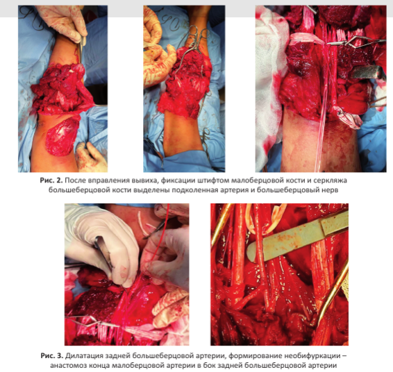 Отмечены отрыв передней большеберцовой артерии (ПББА) на уровне бифуркации подколенной артерии (ПА), отрыв малоберцовой артерии (МБА), контузия и травматический спазм задней большеберцовой артерии (ЗББА).