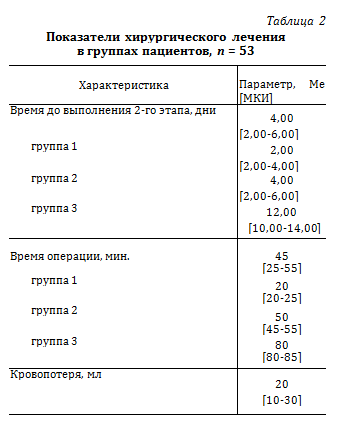 Первый этап лечения, фиксация стержневыми АНФ, был выполнен 44 (83%) пациентам с признаками нестабильности тазового кольца. Характеристика хирургического лечения представлена в таблице 2.