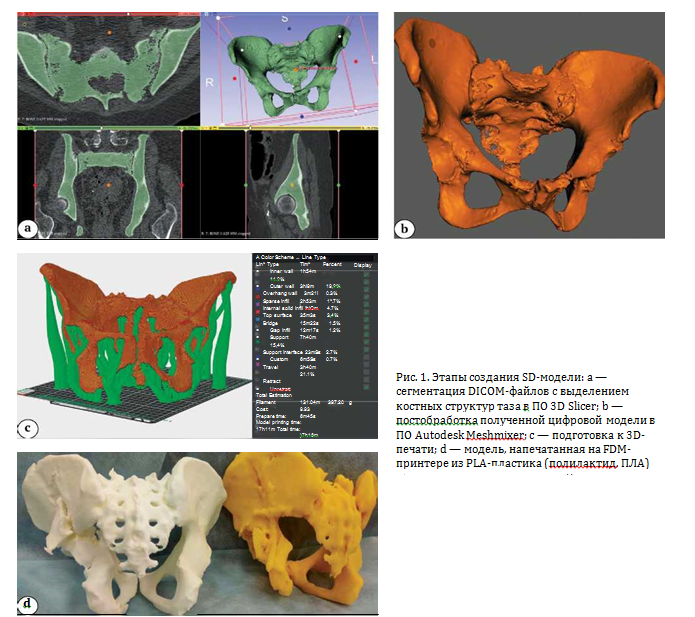 Использована методика интраоперационной навигации на основе 3D-печати FDM-принтером и программного обеспечения (ПО) 3D Slicer [12], Autodesk Meshmixer, Bambu Studio Bambu Lab. В рамках проведенной работы представлен опыт применения 3D-технологий для предоперационной подготовки и интраоперационного взаимодействия оперирующего врача с объемной полимерной 3D-моделью костей таза с различными типами повреждений тазового кольца в зависимости от конкретного клинического случая и с индивидуальными морфо-анатомическими особенностями.