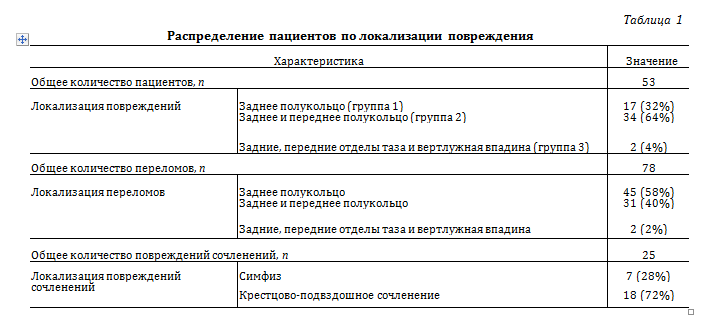 В соответствии с объемом повреждений таза пациенты были поделены на 3 группы: группа 1 — с изолированной травмой заднего полукольца; группа 2 — с травмой заднего и переднего полукольца; группа 3 — травма заднего, переднего полукольца и вертлужной впадины (табл. 1).