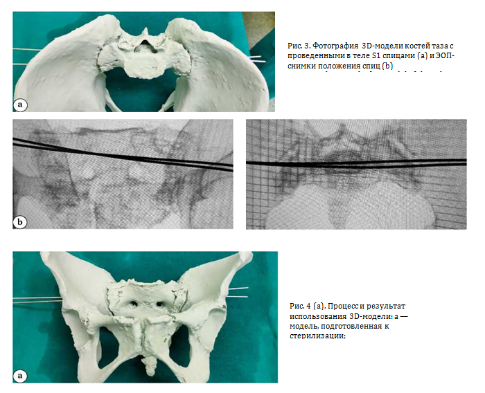 Пациента укладывали на рентгеновском прозрачном операционном столе на спине, в мочевой пузырь предварительно вводился катетер с целью исключения ятрогенного повреждения. Подготавливали предварительно стерилизованную 3D-модель костей таза пациента с размеченными траекториями и точками введения имплантатов и распечатанные фотоснимки с ЭОП-контроля ранее установленных фиксаторов или направляющих спиц в 3D-модели в разных проекциях.