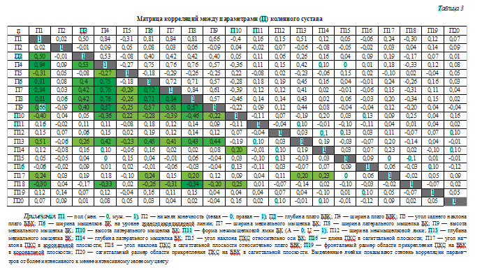 Для изучения взаимозависимости исследуемых переменных и степени их участия в системной организации коленного сустава проведен корреляционный анализ. Результаты представлены в корреляционной матрице (табл. 3), где пары показателей в соответствии с абсолютной величиной коэффициента ассоциации, взятого по модулю, распределены по диапазонам сильных значений (>0,8; р < 0,05), средних значений (0,5-0,8; р < 0,05), слабых значений (0,3-0,5; р < 0,05) и очень слабых значений (0,2-0,3; р < 0,05).