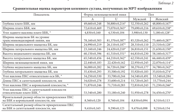 Средние значения 9 параметров коленного сустава (включая пол) статистически значимо отличались у пациентов с различной формой межмыщелковой ямки (р < 0,05). Также найдены значимые половые различия в 14 параметрах, включая форму межмыщелковой ямки (р < 0,05). Сравнение значений параметров показало отсутствие выраженной билатеральной асимметрии в строении коленного сустава (табл. 2).