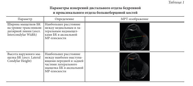 Нами выбран метод МРТ для измерения отдельных параметров КС, т. к. он является доступным и часто применяемым для диагностики патологий сустава и планирования хирургических вмешательств на КС. С помощью МРТ в рутинной практике перед реконструкцией ПКС хирург может оценить сопутствующие повреждения менисков, хряща и связок КС, выраженность дегенеративных изменений сустава, а также толщину и состояние зоны забора трансплантата связки [15, 16]. Немаловажную роль перед хирургическим вмешательством имеет оценка состояния костной ткани, а также размеров мыщелков БК и ББК для планирования формирования длины каналов. Однако с помощью МРТ КС невозможно достоверно оценить область прикрепления ПКС, в особенности бедренного прикрепления связки, и спланировать центр формирования каналов для анатомического размещения трансплантата.
