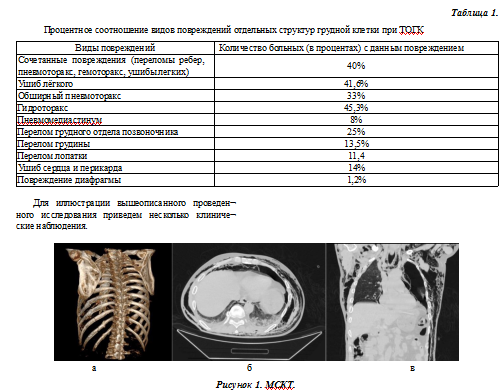 В структуре политравмы 20,2 % составили повреждения грудной клетки. В процессе МСКТ у пациентов с ТОГК диагностировали: 1) наличие и вид повреждения костного каркаса грудной клетки; 2) наличие и степень гемо- и пневмоторакса; 3) характер и выраженность повреждений и нетравматических изменений легких; 4) наличие и характер повреждения органов средостения; 5) наличие торакоабдоминального повреждения; 6) наличие и локализацию инородных тел. В таб. №1 приведены процентное соотношение видов повреждений отдельных структур грудной клетки при ТОГК.