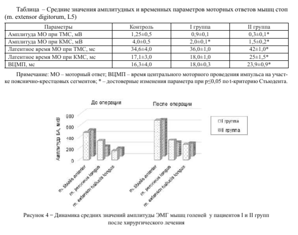 Во II группе даже в более поздние сроки после хирургического вмешательства (12 месяцев), несмотря на общую позитивную динамику БА мышц и улучшение опороспособности конечности, сохранялись электрофизиологические признаки моторной и рефлекторной недостаточности периферических нервно-мышечных структур, а также пояснично-крестцовых сегментов СМ и соответствующих спинномозговых корешков.