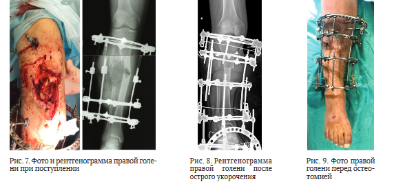 После стабилизации состояния и восстановления функции почек через 34 дня после ранения выполнили повторную хирургическую обработку раны, некрэктомию большеберцовой и малоберцовой костей, ОУ правой голени, ВЧКДО по Илизарову. Дефект большеберцовой кости составил 11 см (рис. 8).