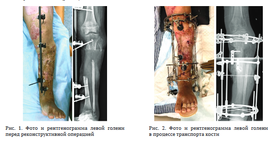 234567 Ключевые слова: огнестрельный перелом, дефект диафиза большеберцовой кости, остеосинтез, несвободная костная пластика по Илизарову, транспорт кости, острое укорочение