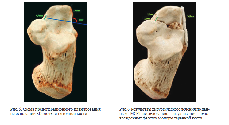 Проведено предоперационное планирование и хирургическое лечение с использованием предлагаемого метода. У пациента определены суставные фасетки типа А, расстояние от пяточно-кубовидного сустава — 1,5 см, угол наклона линии остеотомии относительно наружной стенки пяточной кости — 100º (рис. 5). По данным МСКТ, на следующий день после хирургического лечения ни одна суставная фасетка не была повреждена, угол наклона остеотомии отличался от запланированного на 1°. Расстояние от пяточно-кубовидного сустава отличалось на 1 мм (рис. 6).