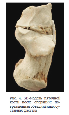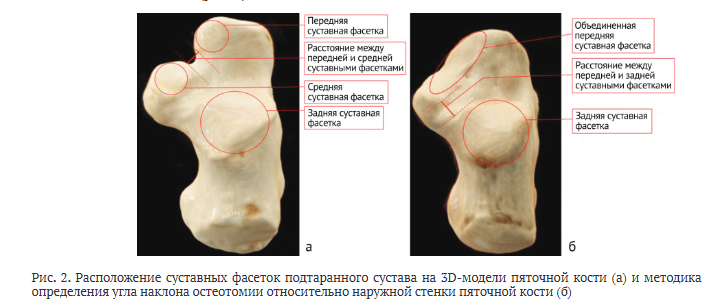 Всем пациентам выполняли мультиспиральную компьютерную томографию (МСКТ) стопы. Полученные изображения последовательно обрабатывали, в результате получали 3D-модель пяточной кости с визуализированными на ней суставными фасетками. Оценивали их форму и расположение.