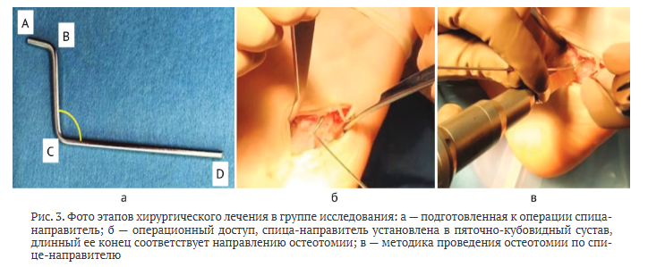 В положении пациента лежа на спине выполняли хирургический доступ непосредственно над передним отростком пяточной кости. Тупым методом послойно скелетировали передний отросток пяточной кости, устанавливали два ретрактора, визуализировали пяточно-кубовидный сустав. Затем в его полость помещали спицу-направитель отрезком AB так, что отрезок BC соответствовал перпендикуляру, проведенному к линии остеотомии, а угол BCD — углу наклона линии остеотомии (рис. 3, б). С вершины C угла BCD по направлению отрезка CD пилой выполняли остеотомию (рис. 3, в). Устанавливали дистрактор, фрагменты пяточной кости смещали, образовавшееся пространство заполняли алло- или аутотрансплантатом, в результате чего достигали коррекции деформации с последующей фиксацией