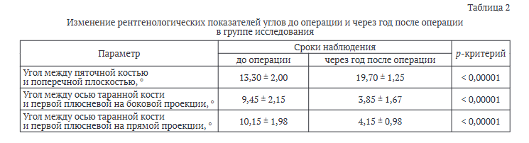 По результатам рентгенографического исследования, на следующий день после операции фиксирующие винты располагались в пяточной кости, не затрагивая суставы, фиксация была стабильной, миграция трансплантата не отмечена. На повторном исследовании через год с нагрузкой на стопу отметили достоверное изменение углов (p ≤ 0,05; табл. 2). Повторную операцию проводили двум (10 %) пациентам в связи с возникшим конфликтом между пластиной и сухожилиями малоберцовых мышц, что приводило к сохранению локального болевого синдрома через год после хирургического лечения.