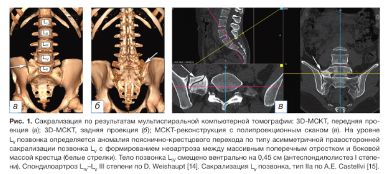 Болевой синдром в области поясничного отдела позвоночника и крестца может быть проявлением большого спектра заболеваний, что обусловливает трудности дифференциальной диагностики. Одной из причин развития болевого синдрома являются патологические изменения в структуре позвоночника, такие как сакрализация LV позвонка [1]. Патология описана в 1917 году итальянским учёным Mario Bertolotti, он же впервые связал клинические проявления дисплазии с поясничными болями [2]. Аномалия характеризуется удлинением поперечного отростка V поясничного позвонка и его полным либо частичным сращением с первым сегментом крестца. Структурные изменения приводят к изменению биомеханики движений и перераспределению давления на позвонки и суставной комплекс, компрессии корешков и дегенерации суставов [2].