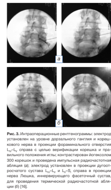 Хирургическое вмешательство. В положении больного на животе проведена местная инфиль- трационная анестезия раствором ропивакаина 5 мг/мл в объеме 10 мл, отступя 10 см от средней линии на уровне LIV-LV тел позвонков из бокового доступа с проколом кожи и подлежащих мягких тканей. Под контролем электронно-оптического преобразователя в стерильном поле через прямую канюлю с острым кончиком проведён активный электрод с мандреном и тефлоновой изоляцией длиной 200 мм, диаметром 20 G, активным кончиком 10 мм к зоне деструкции (область нижнего треугольника межпозвонкового отверстия LIV-LV справа, образованного дугоотростчатыми суставами в месте прохождения корешкового нерва). Контроль расположения конца канюли с помощью контрастирования (1 мл йогексола 300). Введён электрод из термопары для проведения сенсорной и моторной стимуляции. Импедансометрия — диапазон составил 220-230 Ом. Проведено импульсное радиочастотное воздействие в режиме нейромодуляции с использованием генератора Cosman G4 при 42°C в течение 120 секунд (вверх и медиально, затем вниз и медиально, чтобы увеличить размер воздействия на дорсальный ганглий корешка DRG). Электрод и игла удалены. Далее последовательно выполнена термальная радиочастотная абляция (деструкция) возвратного нерва Люшка (при температуре 90° в течение 1,5 минут) под контролем электронно-оптического преобразователя в проекции точки scotty dog на уровне дугоотросчатого сустава LIV-LV и LV-SI справа под местной инфильтрационной анестезией [14, 16]. Электрод и игла удалены. Асептическая повязка. Продолжительность операции 35 минут. Кровопотери нет (рис. 3).