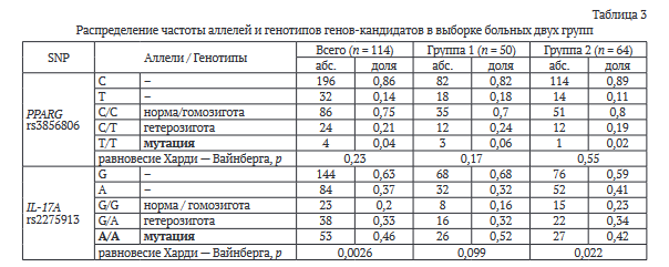 Вычисление равновесия Харди - Вайнберга (р > 0,05) по PPARG (rs3856806) оказалось соблюдено и составило 0,23, что говорит об отсутствии явного влияния данного SNP на возможные ковариаты в двух группах, однако есть смысл провести более детальное изучение его влияния. При вычислении равновесия Харди - Вайнберга по IL-17A (rs2275913) получено его явное несоблюдение как в обеих группах, так и в группе 2 (с рецидивом осложнения): 0,0026 и 0,022 соответственно. Это свидетельствует о влиянии данного полиморфизма на рецидив осложнения.