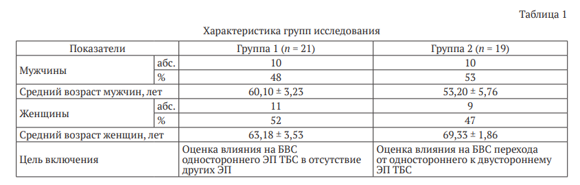 Пациенты разделены на две группы: группа 1 (n = 21) — при ЭП одного ТБС (после 1 этапа эндопротезирования); группа 2 (n = 19) — при ЭП двух ТБС (табл. 1). Группы значимо не различались по полу и возрасту, что позволяет сравнивать полученные данные.