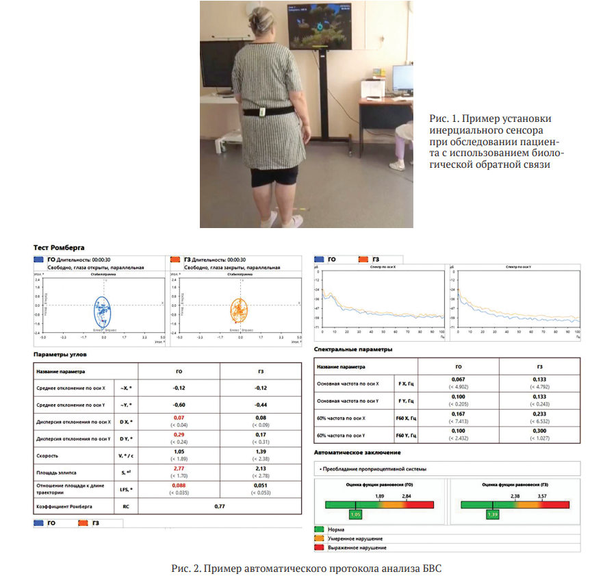 Автоматический протокол (рис. 2) формировался сразу после обследования, фиксировались угловые отклонения сенсора в пояснично-крестцовом отделе позвоночника во фронтальной и сагиттальной плоскостях (среднее отклонение и дисперсия в градусах от вертикали; скорость; площадь; длина колебаний и их отношение к площади эллипса; коэффициент Ромберга как отношение площади при закрытых и открытых глазах). Спектральные показатели представлялись как превалирующая частота и 60 % мощности частоты колебаний по осям. Дополнительно в режиме эмуляции у пациентов проведена оценка ускорений колебаний БВС, позволяющая дополнительно вычленить колебания вверхвниз во фронтальной плоскости, и выделены критериальные для степени напряжения компенсации показатели. В дополнение к стандартной Индивидуальной программе реабилитации всем пациентам в соответствии с клиническими рекомендациями был добавлен стабилотренинг с использованием механизма биологической обратной связи в игровой среде (от 7 до 20 мин № 10 ежедневно).