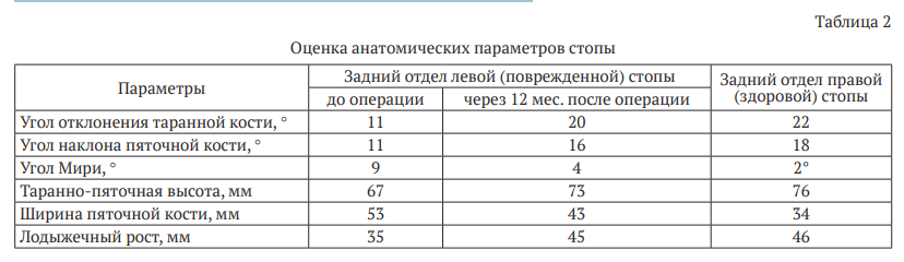 В ходе сопоставления исходной и послеоперационной моделей стопы величины измеренных топографо-анатомических параметров были приближены к значениям, соответствующим анатомической норме на здоровой контралатеральной конечности (табл. 2).
