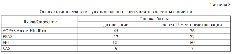 Достигнутые послеоперационные результаты свидетельствуют о значимом улучшении состояния поврежденной стопы по сравнению с исходными значениями, полученными до проведения корригирующего реконструктивного вмешательства на левой пяточной кости (табл. 3). На момент контрольного осмотра через 12 месяцев после операции пациент демонстрировал высокий уровень двигательной активности, совершая до 12 700 шагов в день. Пациент смог вернуться к обычной трудовой деятельности, что также косвенно характеризует позитивные изменения в качестве его жизни.