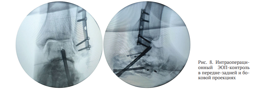 После изготовления индивидуального резекционного блока пациенту выполнено оперативное вмешательство с применением разработанного нами метода, в ходе которого достигнута планируемая коррекция деформации (рис. 8). Учитывая выраженное натяжение ахиллова сухожилия после репозиции костных фрагментов, пациенту осуществлена чрескожная ахиллотомия по Вульпиусу, в результате чего удалось достичь практически полного восстановления объема движений в левом голеностопном суставе.