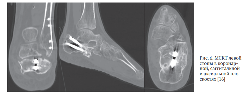 Для уточнения хода линий перелома, взаиморасположения и степени консолидации фрагментов пяточной кости пациенту выполнена МСКТ левой пяточной кости, в ходе которой подтвержден исходный суставно-депрессионный характер перелома, выраженный пяточно-малоберцовый конфликт, а также уточнены форма и взаиморасположение консолидированных фрагментов пяточной кости и металлоконструкций (рис. 6).