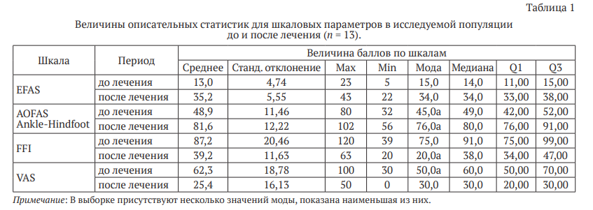 Величины описательных статистик для шкаловых параметров у исследуемых пациентов, проопретированных с применением разработанного нами метода, представлены в табл. 1. Исходные характеристики пациентов до выполнения лечения: по шкале FFI отмечена высокая медианная величина, свидетельствовавшая о значительных ограничениях функциональных и повседневных возможностей пациентов. Это также подтверждается зарегистрированными низкими медианными величинами по шкалам AOFAS Ankle-Hindfoot, EFAS и высокими значениями медианы болевых ощущений по VAS в 60 мм (табл. 1), что говорит о наличии выраженных функциональных ограничений и одновременно выраженных болевых ощущениях, а также об их негативном влиянии на общее самочувствие пациентов. Исходы хирургического лечения на момент завершения участия пациентов в исследовании характеризовались значительным улучшением показателей по всем анализируемым шкалам (табл. 1).