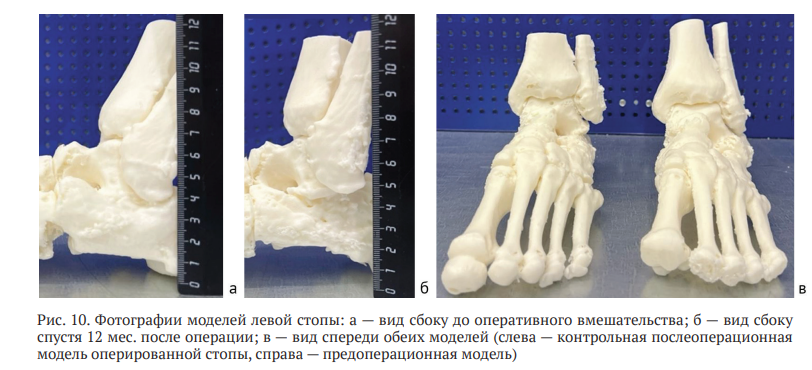 Для визуальной оценки результатов хирургического лечения выполнена трехмерная реконструкция левой стопы на основе данных МСКТ, проведенной через 12 месяцев после оперативного вмешательства. На основании этих данных методом аддитивного производства (3D-печати) изготовлена пластиковая модель стопы, которую сравнили с исходной пластиковой моделью, напечатанной до проведения хирургического лечения на этапе предоперационного планирования (рис. 10). Наблюдали коррекцию латерального пяточно-малоберцового импиджмента и устранение вальгусной деформации заднего отдела стопы. Фотографии моделей левой стопы демонстрируют увеличение «лодыжечного роста» на 10 мм по сравнению с предоперационной моделью (рис. 10, б).