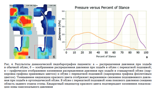 Ограничения экстензии 1 ПФС у пациентов с ОА за счёт полужесткой и закругленной подошвы подошвой в области носка обуви с перекатной подошвой приводят к снижению интенсивности болевого синдрома. Также данная форма подошвы позволяет снизить нагрузку и давление в проекции переднего отдела стопы [33], что подтверждено результатами нашего исследования, и увеличить значение показателей пикового давления и силы в заднем отделе стопы [34].