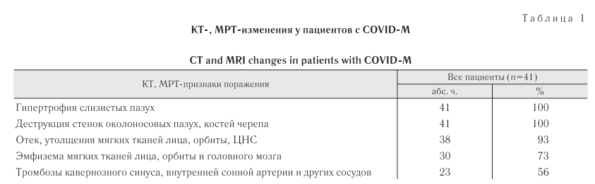 Очень важным диагностическим КТ- и МРТ-признаком риноорбито-церебрального мукормикоза является наличие эмфиземы мягких тканей лица, орбиты и/или головного мозга (73%). Одним из маркеров лучевых методов исследования COVID-M можно считать тромбоз кавернозного синуса, внутренней сонной артерии и других сосудов (56%). По данным иностранных авторов, основными лучевыми признаками были гипертрофии слизистых оболочек околоносовых пазух, отек и утолщение мягких тканей лица, деструктивные изменения костей черепа, поражение структур орбиты и головного мозга [2, 7, 18, 21].