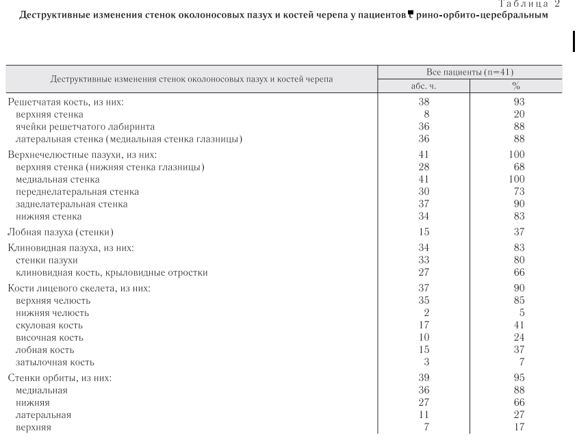В исследование включили 41 пациента с рино-орбито-церебральным мукормикозом. Все пациенты были взрослыми в возрасте от 22 до 83 лет, медиана возраста составила 61±2,34 года. Из них мужчин — 56%, женщин — 44%. Основными фоноПоражение стенок верхнечелюстных пазух выявлено у 100% пациентов, стенок и ячеек решетчатой кости — 93%, стенок лобной пазухи — 37%, стенок основной пазухи и клиновидной кости — 83%, стенок орбит — 95%, верхней челюсти — 85%, нижней челюсти — 5% (табл. 2), отек, утолщение мягких тканей лица, орбиты и ЦНС — 93%, эмфизема мягких тканей лица, орбиты и головного мозга — 73% (см. табл. 1), поражение зрительного нерва — 66%, поражение лобной доли — 32%, поражение височной доли — 15%, поражение затылочной доли — 2%, тромбоз кавернозного синуса — 46%, внутренней сонной артерии — 5% (табл. 3).