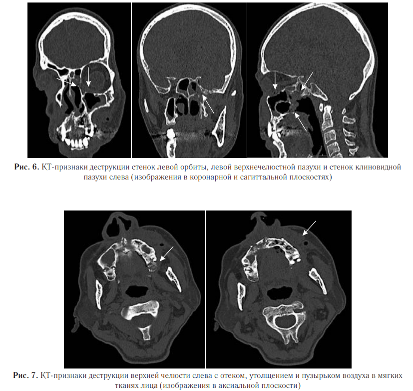 В левой верхнечелюстной пазухе наблюдали деструкцию и истончение переднелатеральной стенки, а также отек и утолщение мягких тканей лицевой области слева с пузырьками воздуха (рис. 4).