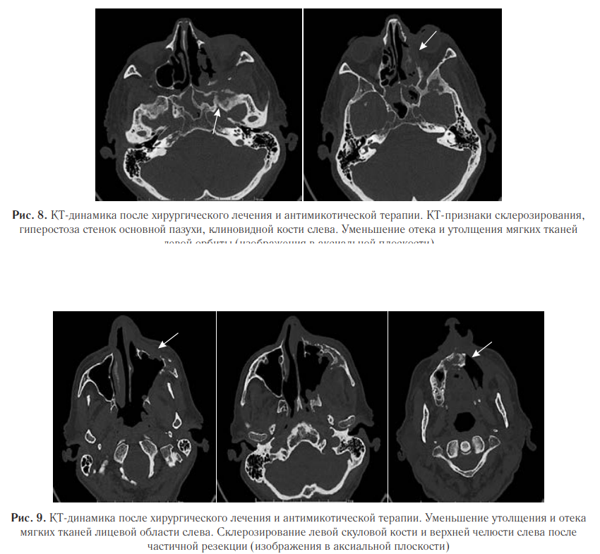 Также были выявлены деструктивные изменения верхней челюсти с утолщением и эмфиземой мягких тканей лицевой области слева (рис. 7). Пациент был переведен в специализированное отделение. Проведена секвестрэктомия верхней челюсти, удаление зубов слева. В гистологических препаратах послеоперационного материала выявлены нити мицелия. При пересмотре гистологического материала в НИИ Медицинской микологии им. П. Н. Кашкина, был обнаружен широкий несептированный мицелий, характерный для мукоромицетов. На основании клинической картины, данных КТ и микологического обследования был диагностирован COVID-ассоциированный мукормикоз околоносовых пазух и структур орбиты. Назначили антимикотическую терапию: введение липосомального амфотерицина В 10 мг/кг в сутки, после стабилизации состояния переход на пероральную терапию. По месту ведения пациента была начата антимикотическая терапия липидным амфотерицином В 14 дней, далее амфотерицином В дезоксихолатом, который был отменен ввиду нефротоксичности. В последующем лечение продолжили изавуконазолом в стандартной дозе. Согласно международным рекомендациям, проводился контроль уровня глюкозы крови и произведена отмена ГКС. Общая продолжительность лечения составила 105 дней. Ежедневно в первую неделю, затем по мере необходимости проводили осмотр области оперативного вмешательства с местной обработкой слизистых оболочек препаратами амфотерицина В. После проведенной антимикотической терапии на контрольных МСКТ ОНП выявили признаки стабилизации мукормикоза в виде отсутствия прогрессирования процесса; склерозирования, утолщения и гиперостоза костей; уменьшения отека и утолщения мягких тканей с их фиброзированием (рис. 8, 9).
