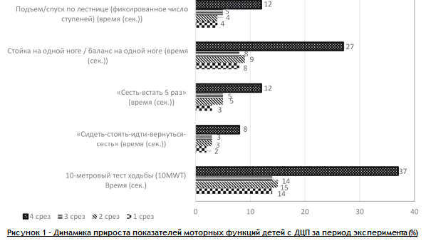Проведен анализ показателей функциональной мобильности при диагнозе парапарез детей со слабостью и частичным параличом нижних конечностей по 5 контрольным тестам и отслежена динамика данных показателей за период эксперимента
