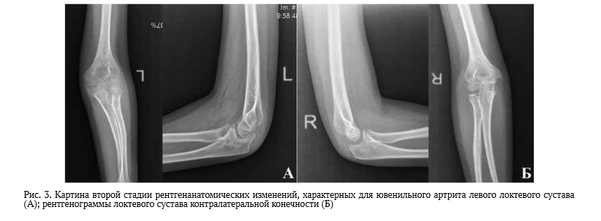 Выявление признаков деформации в виде характерной неровности или зазубренности субхондрального контура суставной поверхности блоковидной вырезки локтевого отростка локтевой кости или головки луча в области лучелоктевого сочленения у детей свидетельствовали о начале или активном процессе формирования эрозивного компонента и прогрессировании заболевания (II стадия анатомических изменений). Рентгенологические признаки ускоренной оссификации хрящевых моделей и ее неравномерная асимметрия в эпифизах, образующих сустав, выглядели более наглядными у детей младшего возраста в дебюте и периоде разгара заболевания. Следует обратить внимание, что данного рода изменения при ЮИА должны наблюдаться во всех структурах, образующих сустав, подверженных артритическому процессу различной степени выраженности, без исключения.
