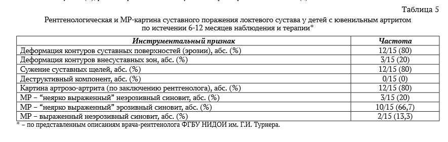 Таким образом, у большинства детей имел место вариант течения артропатии локтевого сустава по типу “сухого” синовита с прогрессирующим характером формирования контрактуры без утренней скованности и выраженного болевого синдрома.