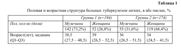 При изучении половой и возрастной структуры больных были получены значимые различия, которые представлены в таблице 1.